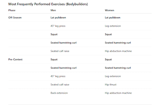 Exercise selection in women: During the off-season, the most common exercises were seated hamstring curls, squats, leg extensions, lat pulldowns, and hip abduction machine. During contest prep, squats, seated hamstring curls, leg extensions, hip thrusts, and hip adduction machine were prioritized.