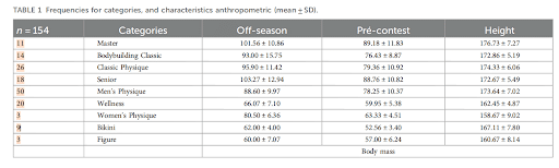 Athletes reported training data for both their off-season and contest prep periods. The survey captured the number of exercises performed per muscle group, the average number of sets per exercise, and the weekly frequency of training for each muscle group.